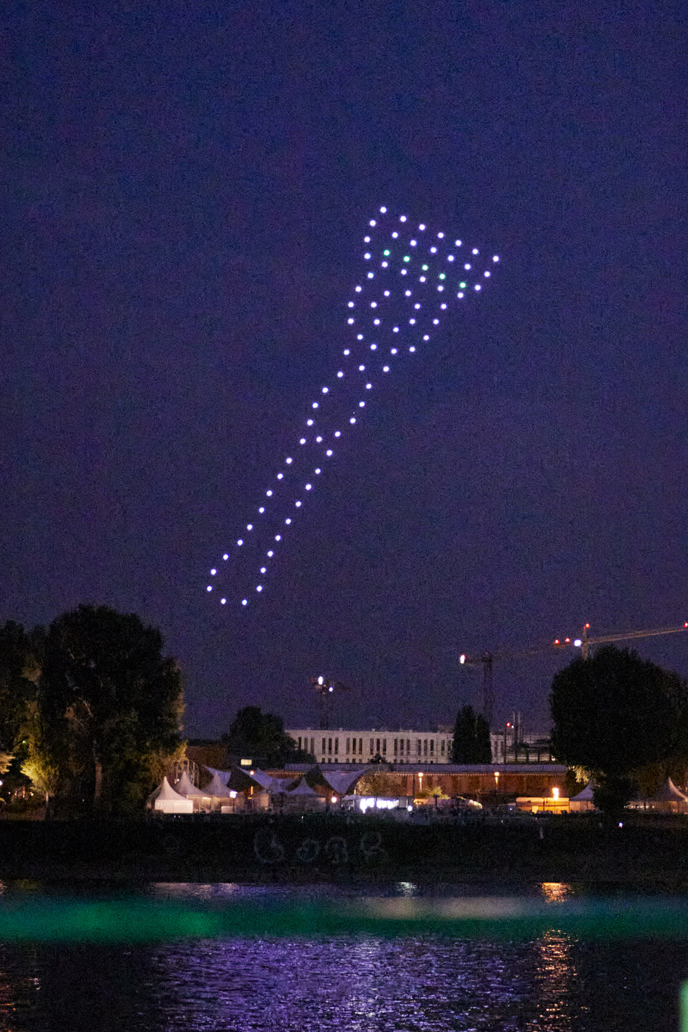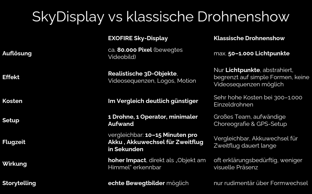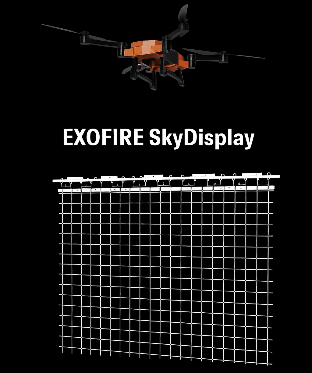 Das von EXOFIRE entwickelte SkyDisplay ist ein rund 100 m² großes, hochauflösendes LED-Display, das an einer Drohne getragen wird und nachts realitätsnahe Objekte am Himmel erzeugt – sichtbar selbst aus großer Entfernung. Durch seine nahezu transparente Bauweise bleibt das Display im Dunkeln unsichtbar, sodass die Inhalte scheinbar frei im Luftraum schweben